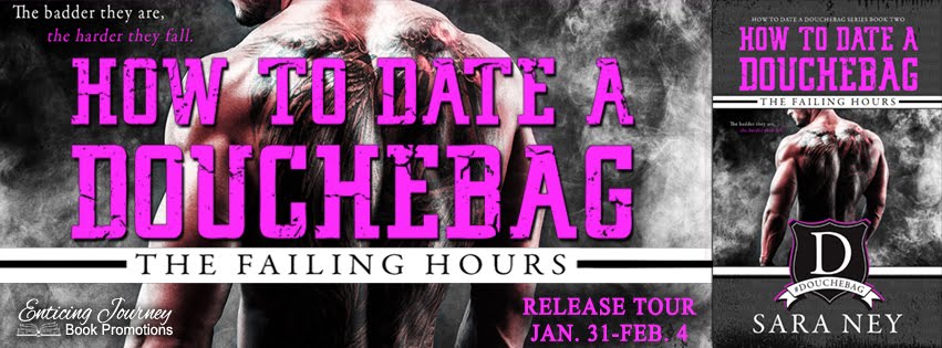 Ok, so, a girl has to be honest when it comes to doing reviews. Anyone that knows me or reads this blog with any kind of consistency knows that I don’t do well with ‘funny’. Sarcasm – i’m really good with but funny books are altogether different. M.E Carter (if you havne’t read her books then you really should) introduced me to Sara Ney. I have to say I was a but apprehensive but when an author I trust sends me in the direction of another I take note. So a couple of months ago I read How To Date a Douchebag and I absolutely loved it. When I had the opportunity for an early read of #2 The Failing Hours, well that was a no brainer.