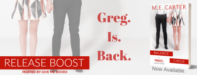 I have read all of M.E Carters books to date (except one – shuush please don’t tell her – I will get on it, pinkie promise) but when the opportunity to review this came up i actually didn’t jump at it like I would have done had it been part of the Texas Mutiny series. I kept coming back to it thought and finally the fact that it was M.E Carter got the better of me and I signed up. So not only did I have to read Balance Check, I also had to read Getting a Grip because you know they go together (great now I have that song from the end of Grease in my head), two funny books when I wasn’t sure that I would be able to handle one.